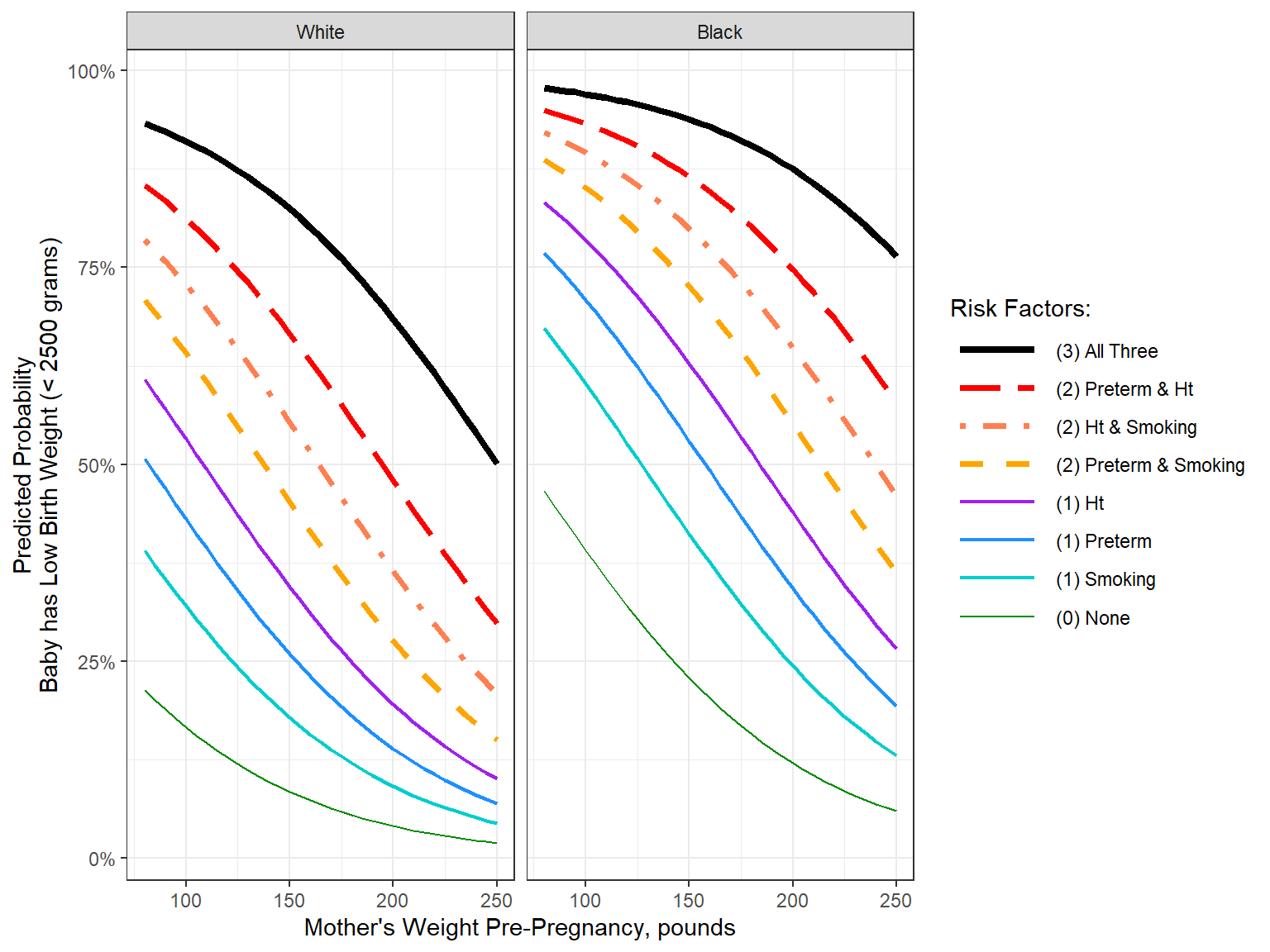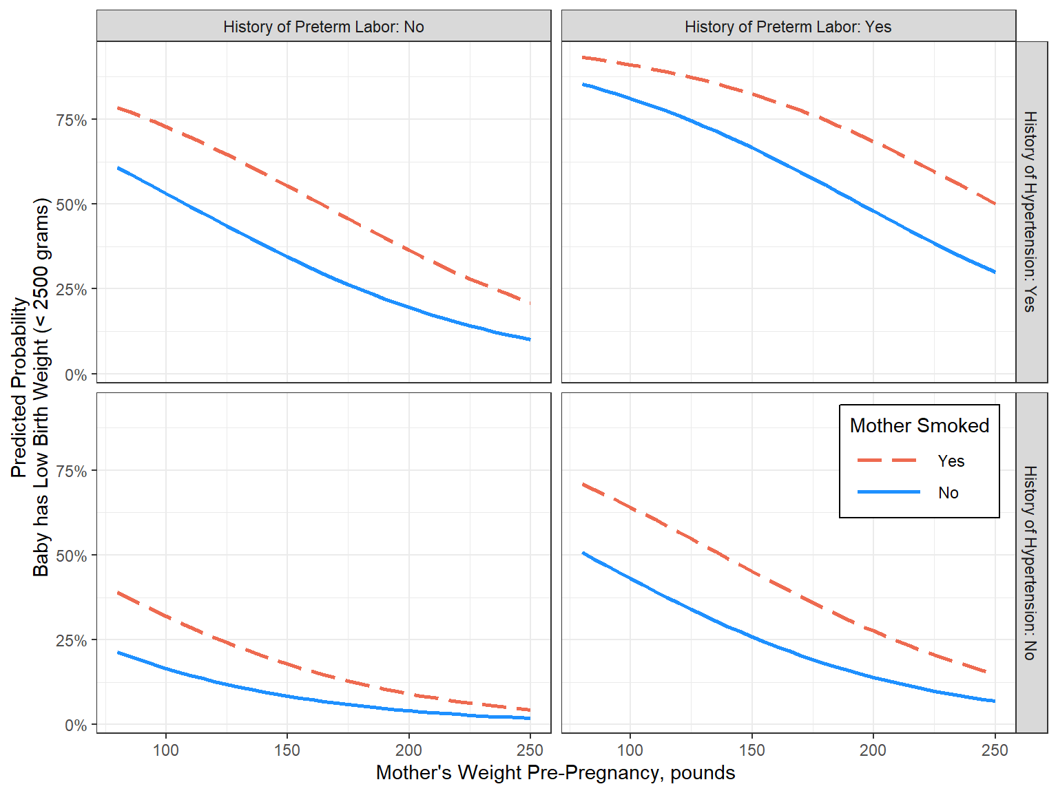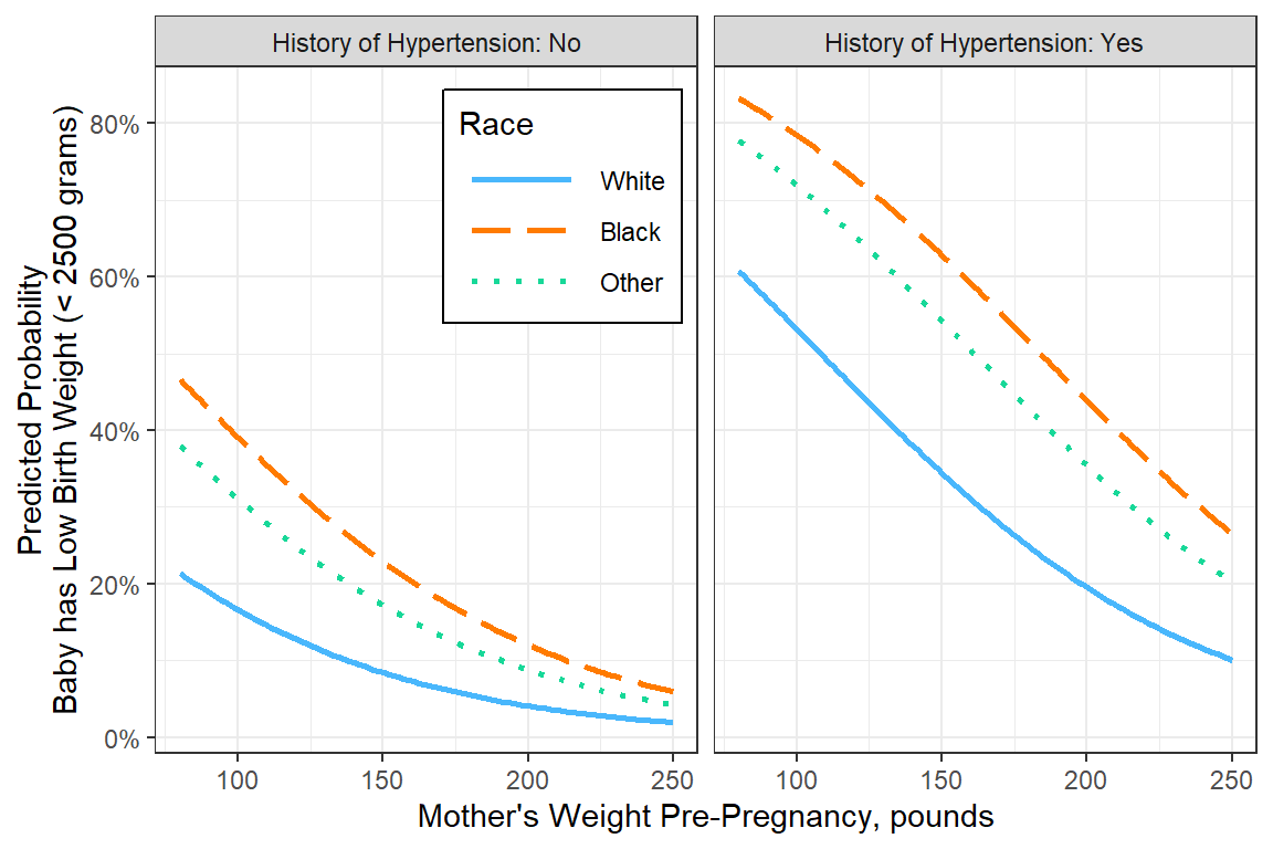 y = "Predicted Probability\nBaby has Low Birth Weight (< 2500 grams)",