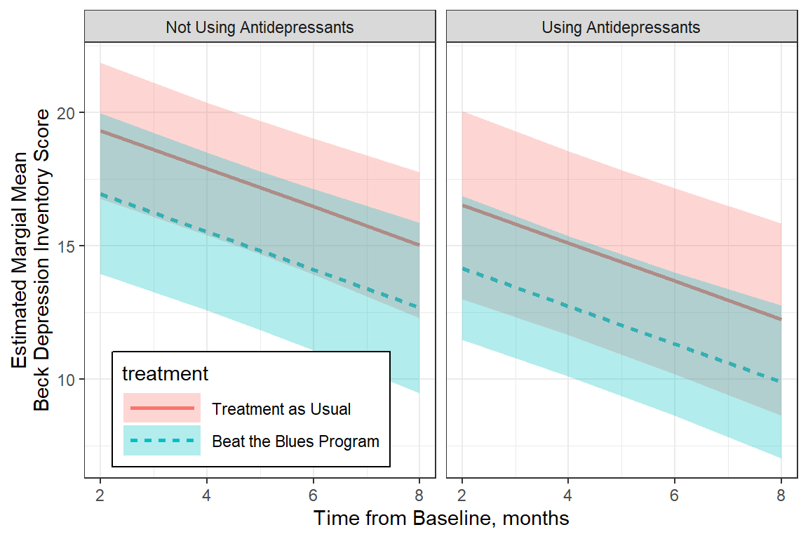 Net of other factors (use of antidepressants and length of the current episode), does the Beat-the-Blues program results in better depression trajectories over treatment as usual?