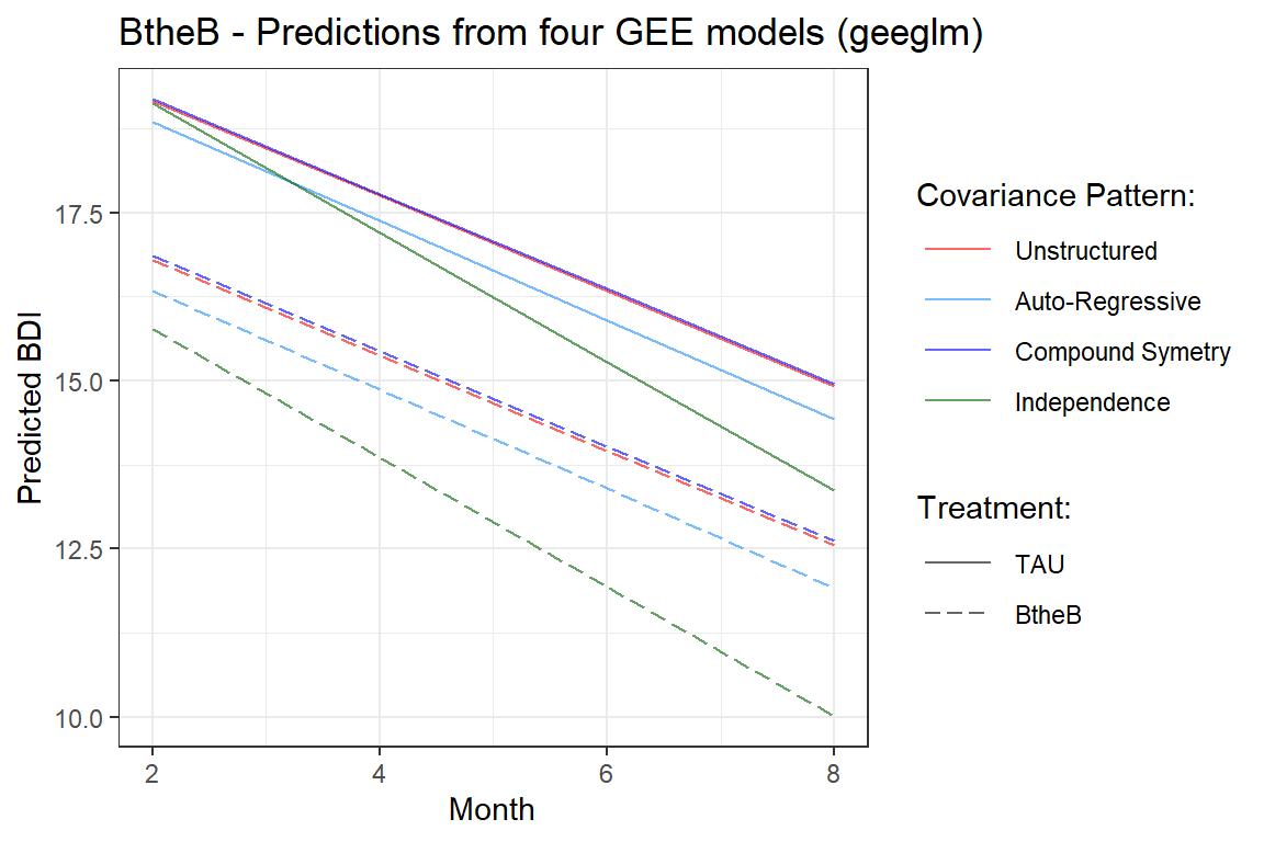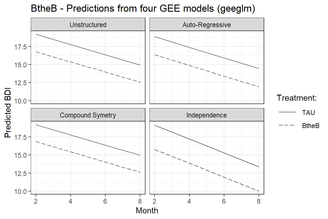 labs(title = "BtheB - Predictions from four GEE models (geeglm)",