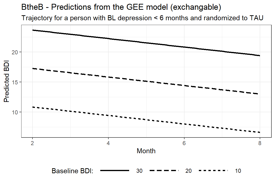 labs(title = "BtheB - Predictions from the GEE model (exchangable)",