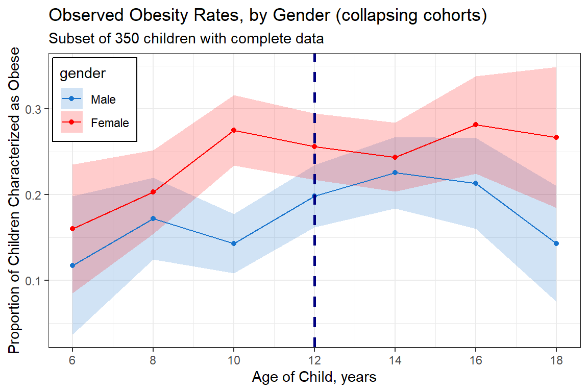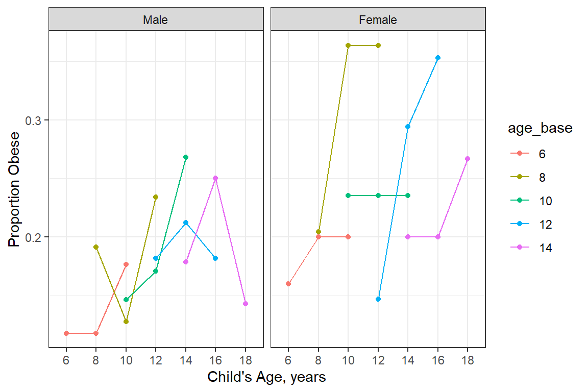 The Muscatine Coronary Risk Factor Study (MCRFS) was a longitudinal study of coronary risk factors in school children in Muscatine, Iowa (Woolson and Clarke 1984; Ekholm and Skinner 1998). Five cohorts of children were measured for height and weight in 1977, 1979, and 1981. Relative weight was calculated as the ratio of a child’s observed weight to the median weight for their age-sex-height group. Children with a relative weight greater than 110% of the median weight for their respective stratum were classified as obese. The analysis of this study involves binary data (1 = obese, 0 = not obese) collected at successive time points.