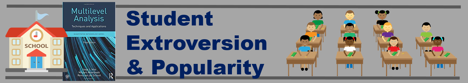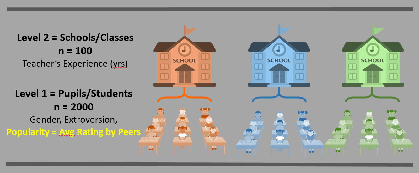 pupil) in 100 schools (class). The purpose is to offer a very simple example for multilevel regression analysis.The main OUTCOME or DEPENDENT VARIABLE (DV) is the pupil popularity, a popularity rating on a scale of 1-10 derived by a sociometric procedure. Typically, a sociometric procedure asks all pupils in a class to rate all the other pupils, and then assigns the average received popularity rating to each pupil (