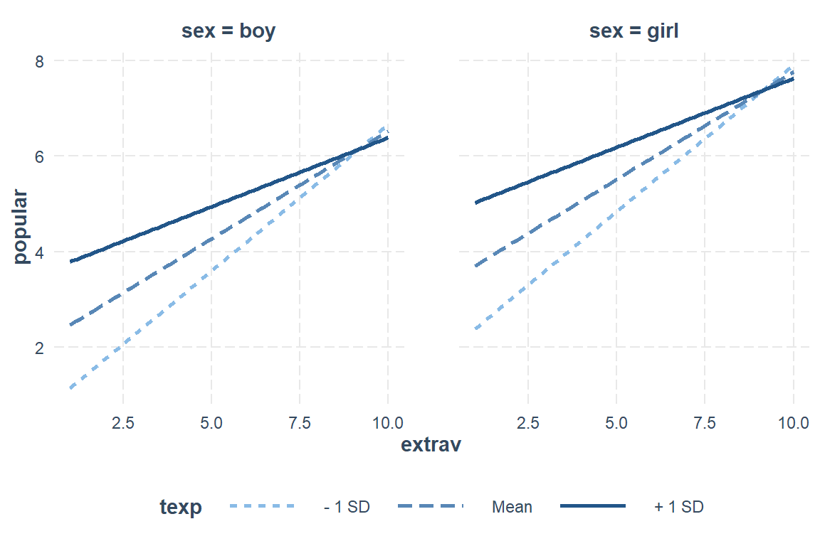 effects::Effect(focal.predictors = c("sex", "extrav", "texp"),