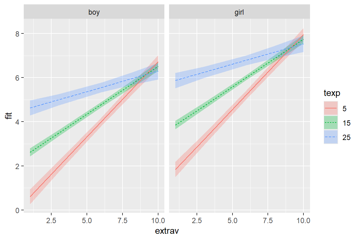 effects::Effect(focal.predictors = c("extrav", "texp"), # choose not to investigate sex (the reference category will be used)