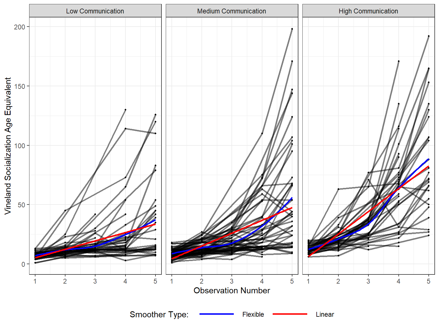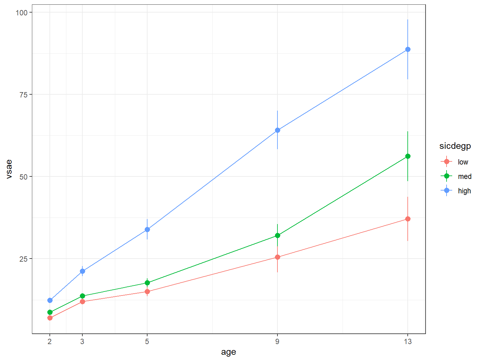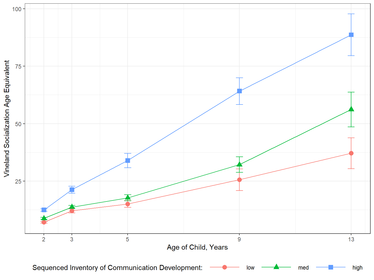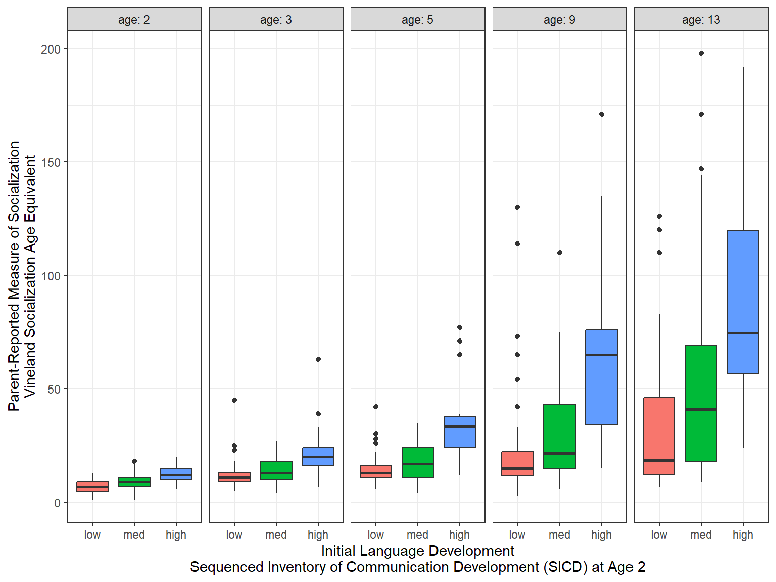 Study participants were children who had had consecutive referrals to one of two autism clinics before the age of 3 years. Social development was assessed at each age using the Vineland Adaptive Behavior Interview survey form, a parent-reported measure of socialization. VSAE (Vineland Socialization Age Equivalent), was a combined score that included assessments of interpersonal relationships, play/leisure time activities, and coping skills. Initial language development was assessed using the Sequenced Inventory of Communication Development (SICD) scale; children were placed into one of three groups (sicdegp) based on their initial SICD scores on the expressive language subscale at age 2.